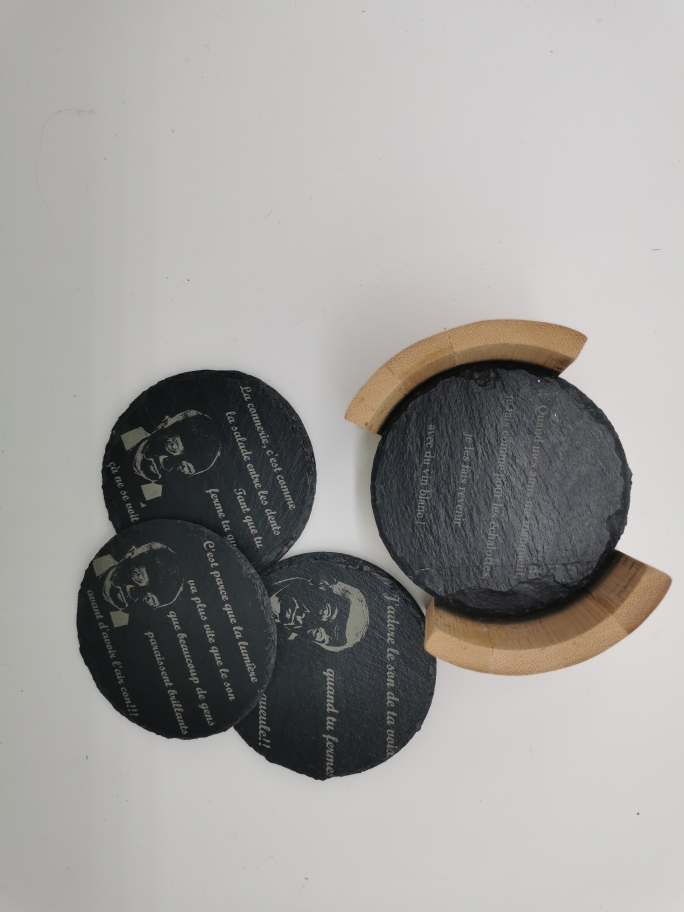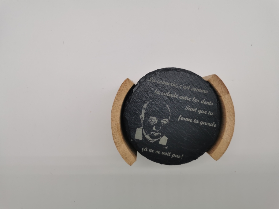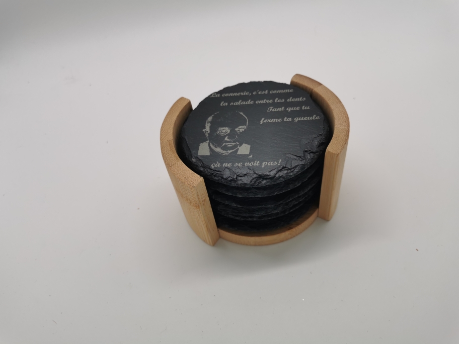 Chaque dessous de verre est gravé avec une citation humoristique ou une réplique de film culte.